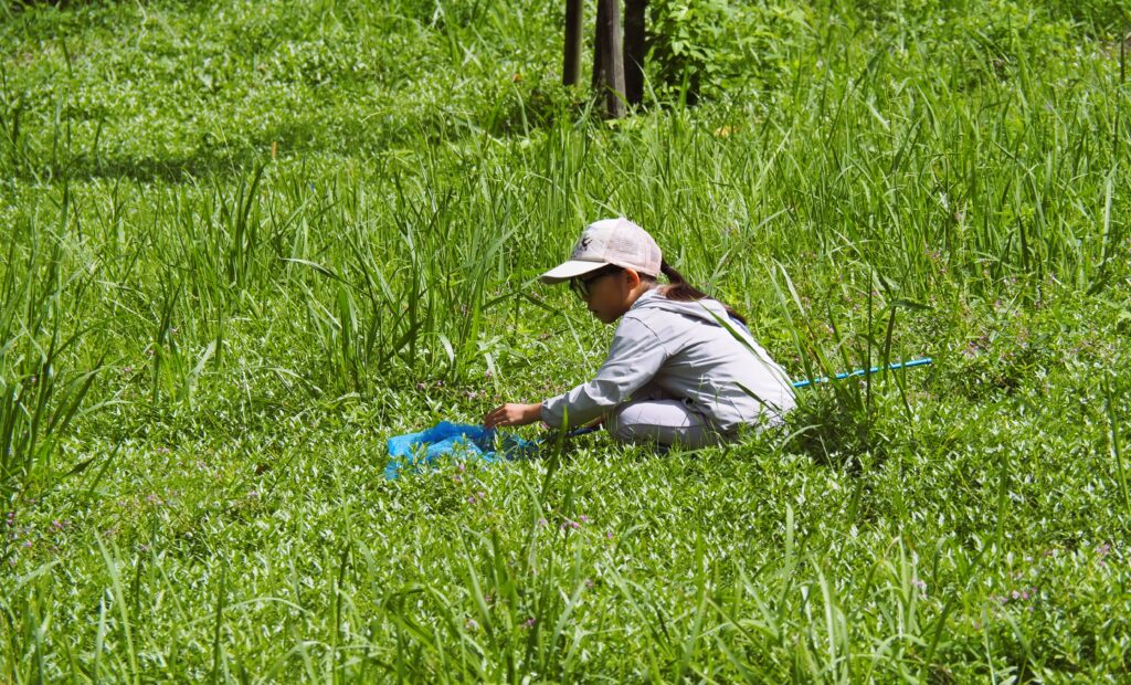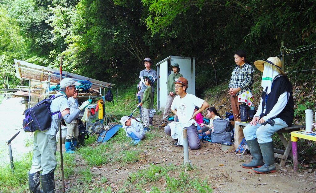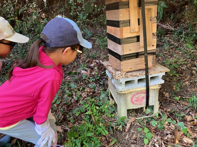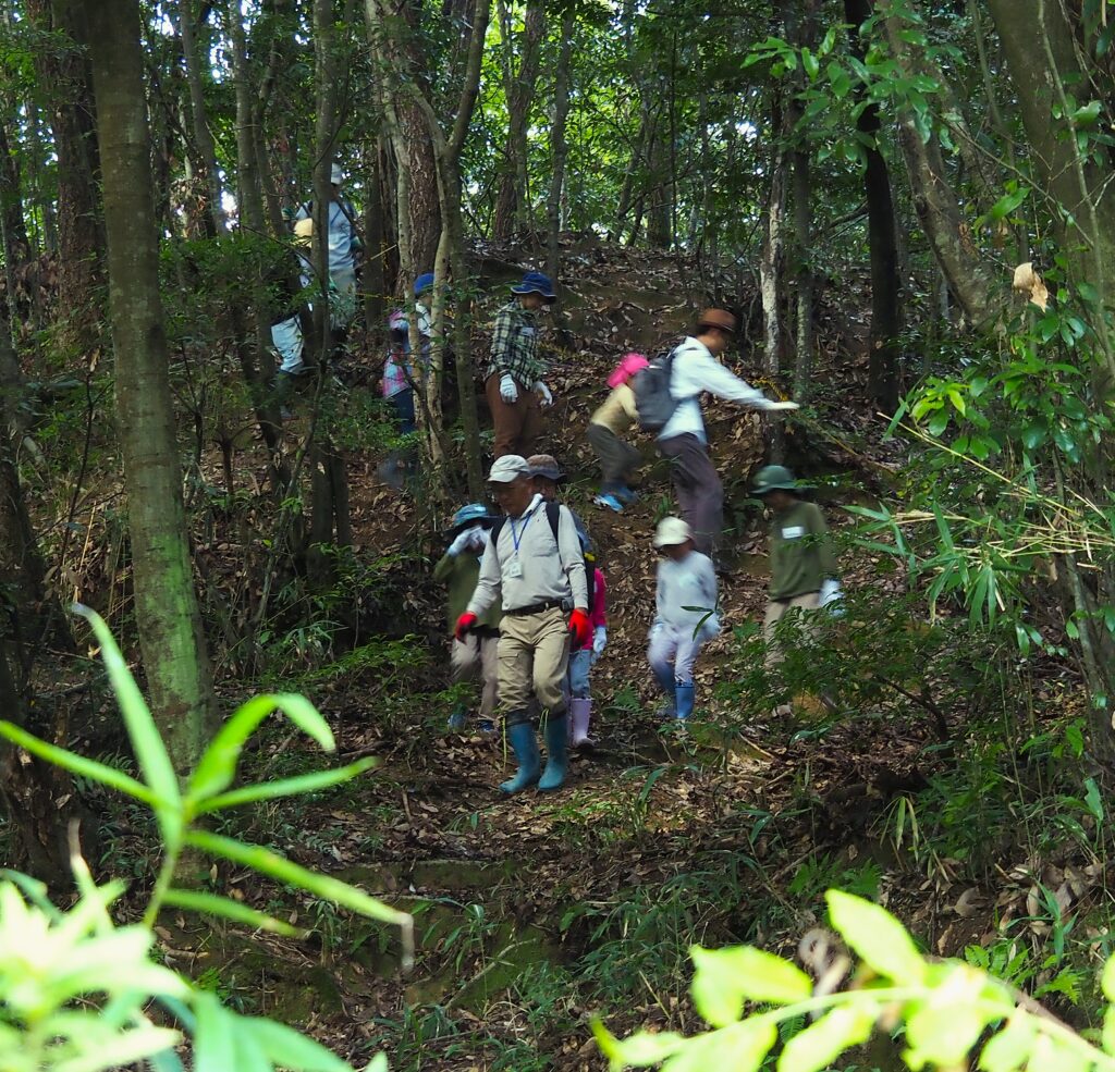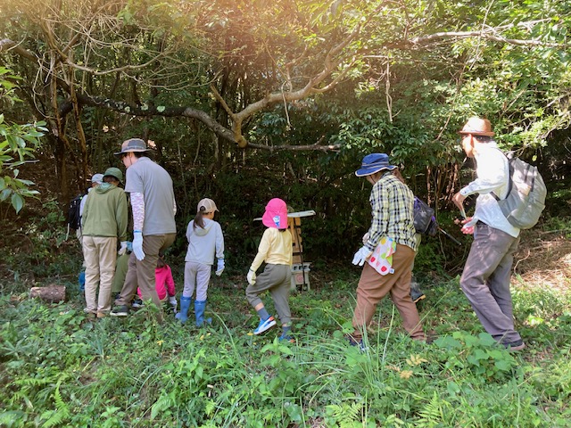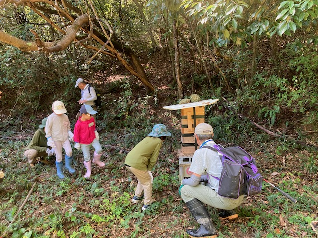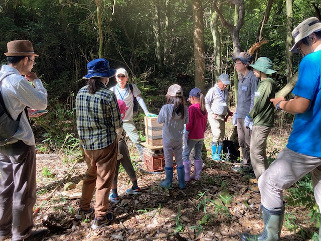 ミツバチに気に入られなかった待ち受け巣箱設置場所に移動し、ニホンミツバチの養蜂について説明 Photo. by Ms.Fujita H.