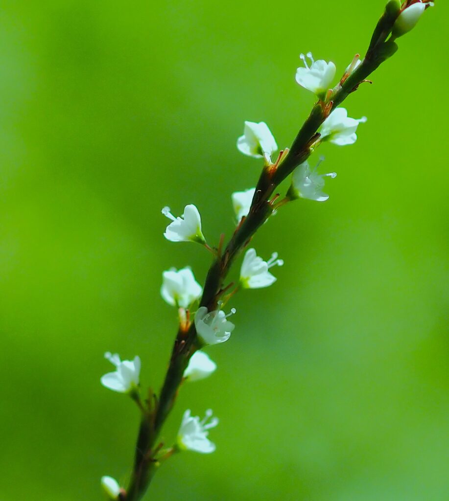 シロバナサクラタデの咲く事務所前のビオトープ池経由で・・・
