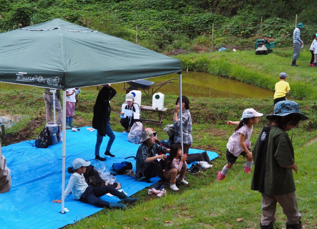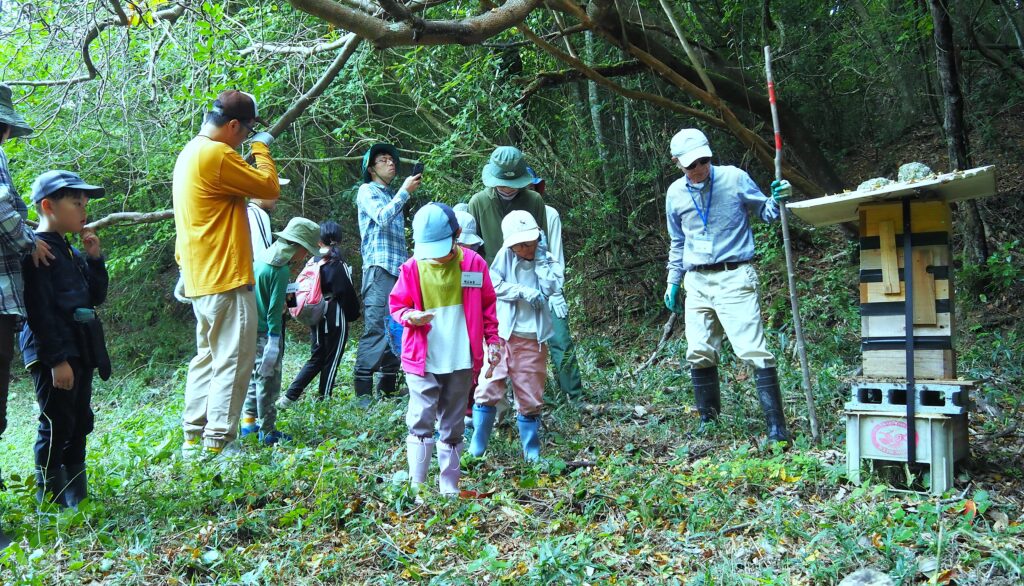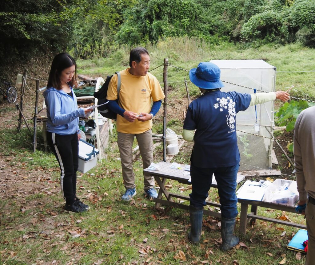 台風22・23号、更に北よりの低気圧から日本海に伸びる秋雨前線の影響で天候がコロコロ変わり急に霧雨になってきたこともあり、予定より少し早いのですが今日のイベントは終了とします。富田代表の閉会挨拶と今後の予定で終わりですが・・・先日の「養蜂と秋の虫」に参加できなかった方に、これから養蜂見学をサービスします。