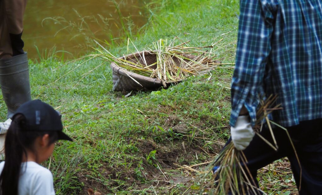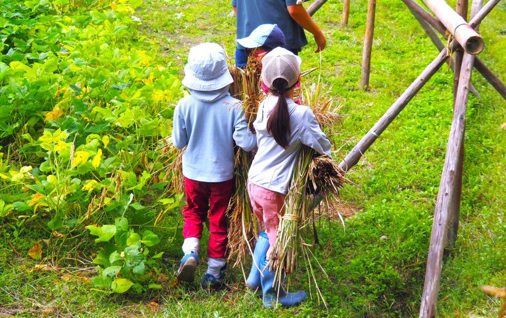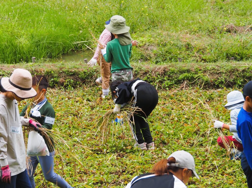 刈り取り・束ねの間に取りこぼしてしまった稲穂を回収します。