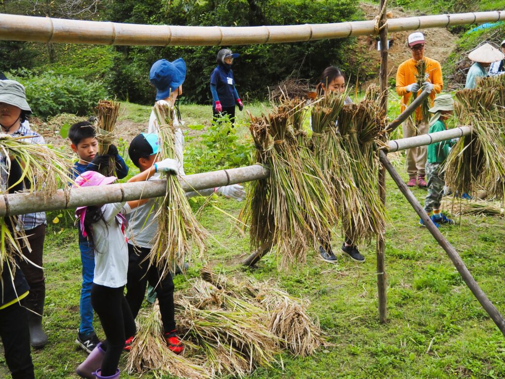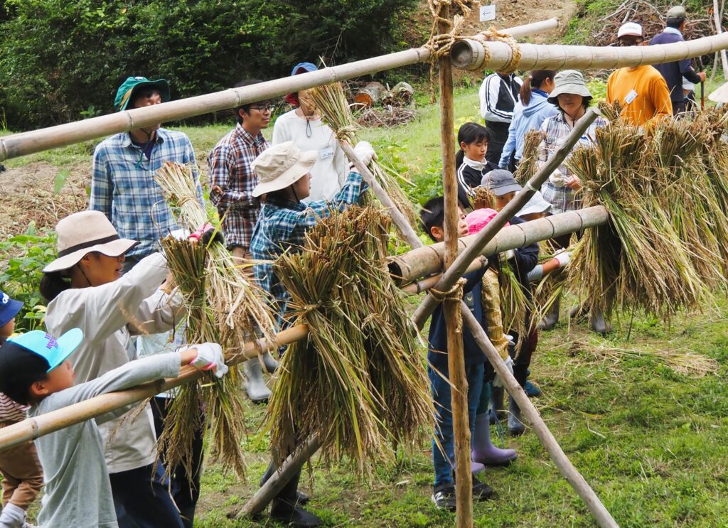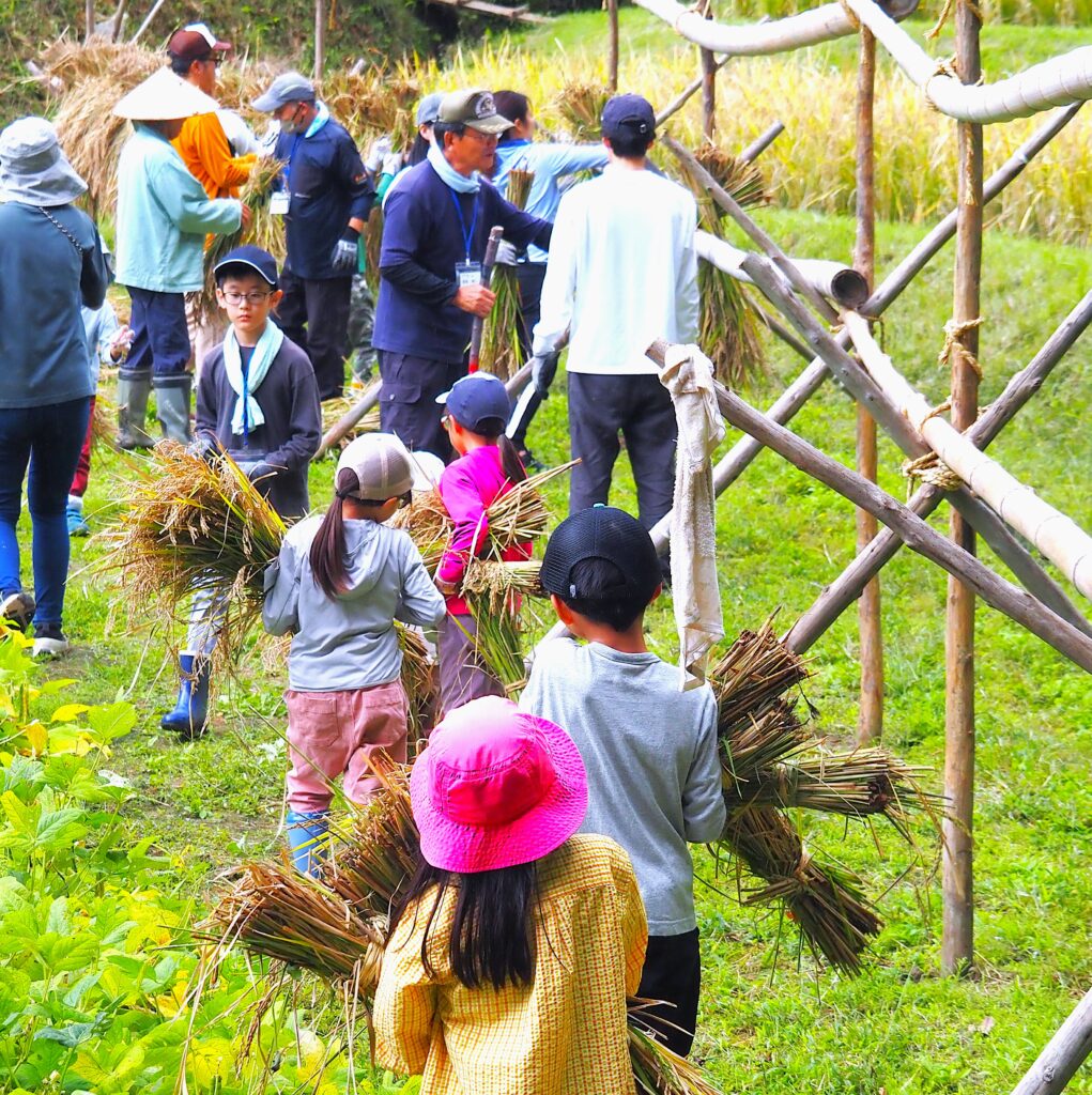 上の棚田に設置した稲木に運び上げて、稲架掛けします。