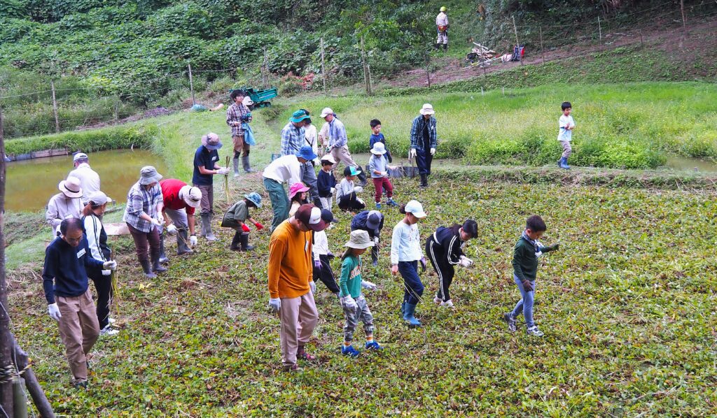 9枚田のビオトープとの間の畦に一列に並んで、いよいよ稲刈り開始。