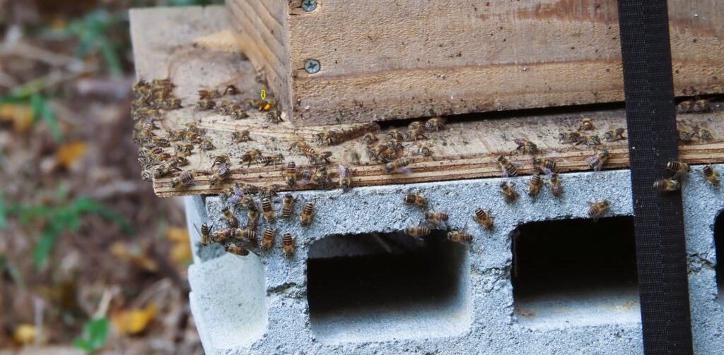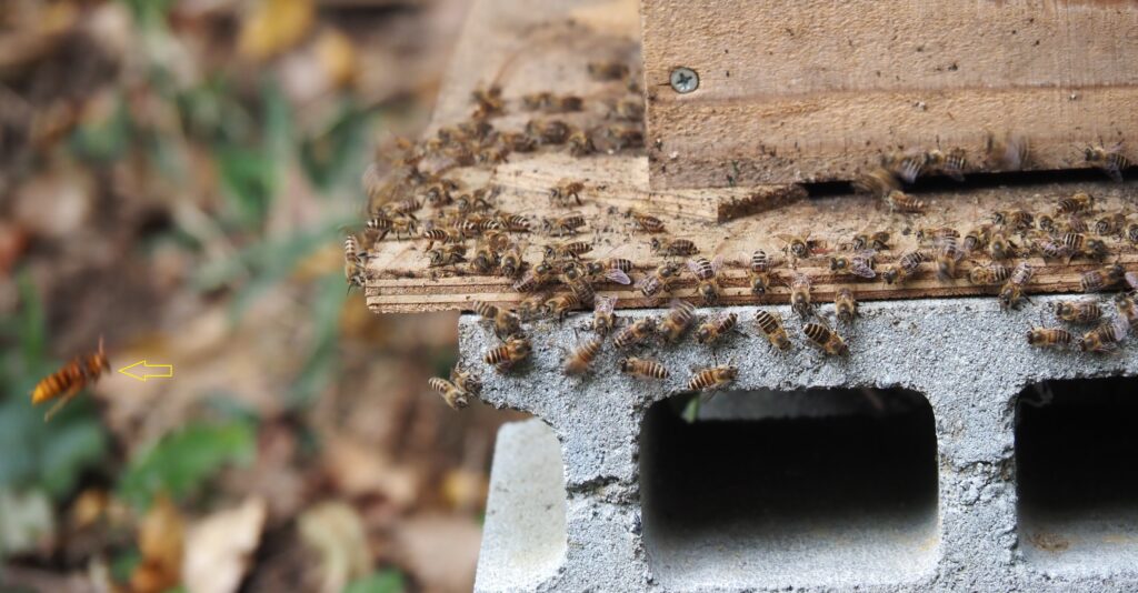 沢山のミツバチが巣箱から出ています。天敵スズメバチの探索?バチ(黄色の矢印の先)に見つかってしまったようです。