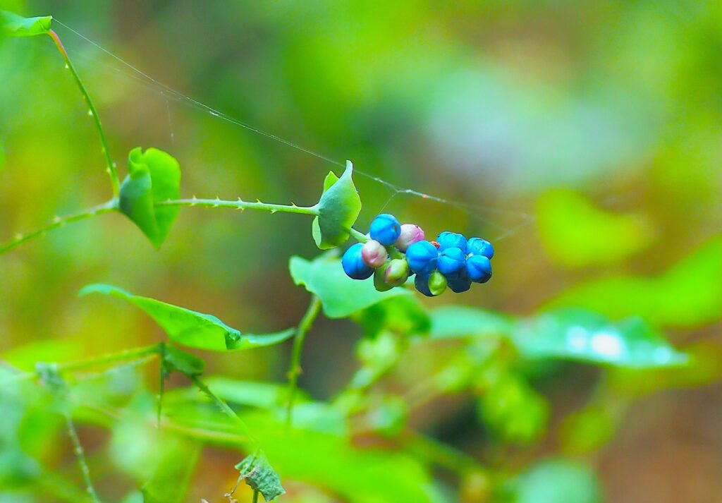 その前で、藍色のイシミカワ(実)がミツバチの防戦を見守ります。